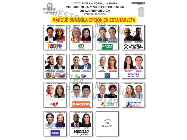 El pasado 25 de marzo se realizó el sorteo que definió la posición de las 14 fórmulas de presidente y vicepresidente de la República en el tarjetón electoral. Este será entregado el próximo 31 de mayo a los votantes que acudan a las urnas para ejercer su derecho al voto en la primera vuelta.