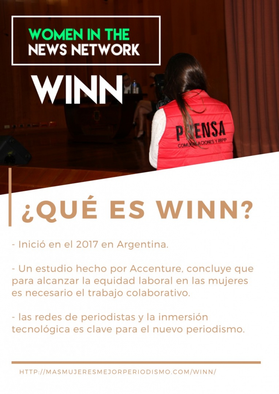 Gabriela Oliván, directora regional de Comunicaciones de Accenture hace referencia que esta red de mujeres periodistas, nace a partir de un estudio de esta misma entidad. Oliván sostuvo en el lanzamiento de la Winn que “las mujeres están en situación de desventaja en lo que respecta a equidad laboral”, además, cuenta que el inicio de este proceso se dio a partir de una serie de reuniones, las cuales dieron forma a la primera red latinoamericana de periodistas mujeres. El desarrollo del ejercicio periodístico de las mujeres que pertenecen a Women in the News Network, se hace a partir de un trabajo colectivo que acompaña a sus miembros por medio de un intercambio colaborativo y capacitaciones que fortalezcan el desempeño de las periodistas.