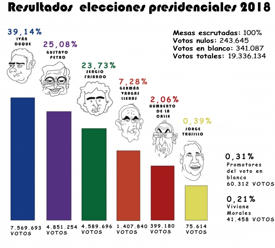 El pasado domingo se realizaron las votaciones para elegir el próximo presidente de Colombia, en lo que según el boletín reportado por la Registraría los grandes protagonistas de esta primera vuelta electoral fueron Iván Duque con un 39,14% de los votos , seguido de Gustavo Petro con 25.08% y Sergio Fajardo con un 23.73% de los votos , lo que quiere decir que este 17 Junio los colombianos tiene que salir a ejercer nuevamente su derecho al voto por la segunda vuelta electoral que se disputa entre los dos candidatos con mayor número de votos Iván Duque y Gustavo Petro.