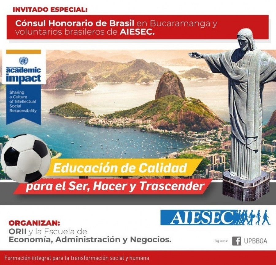 El pasado seis de marzo se realizó un evento de inmersión UPB, con el objetivo de presentar un país ante la comunidad estudiantil, mostrando las oportunidades educativas que este ofrece y exponiendo su riqueza cultural, para esta ocasión el país seleccionado fue Brasil. Esta actividad estuvo a cargo de la Oficina de Relaciones Internacionales e Interinstitucionales, ORII, y la Escuela de Economía, Administración y Negocios, y se desarrolló en el Auditorio Monseñor Jesús Quirós Crispín de la Universidad Pontificia Bolivariana Seccional Bucaramanga.