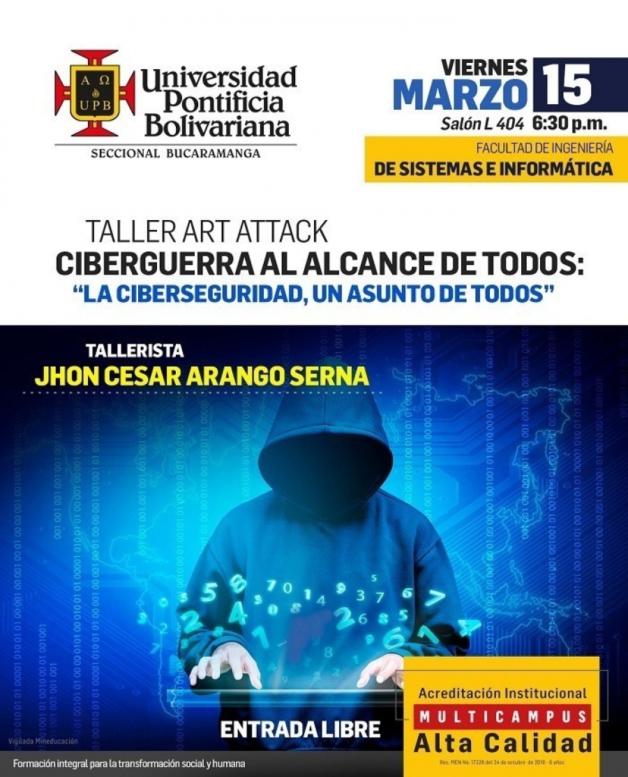 Con el objetivo de disminuir vulnerabilidades tecnológicas y con ello mitigar el espectro de un ataque informático hoy 15 de marzo a las 6:30 de la tarde en el salón L 404 de la Universidad Pontificia Bolivariana Seccional Bucaramanga se llevará a cabo el taller Art Attack – Ciberguerra al alcance de todos, orientado por el Ingeniero de Sistemas Jhon Cesar Arango Serna.