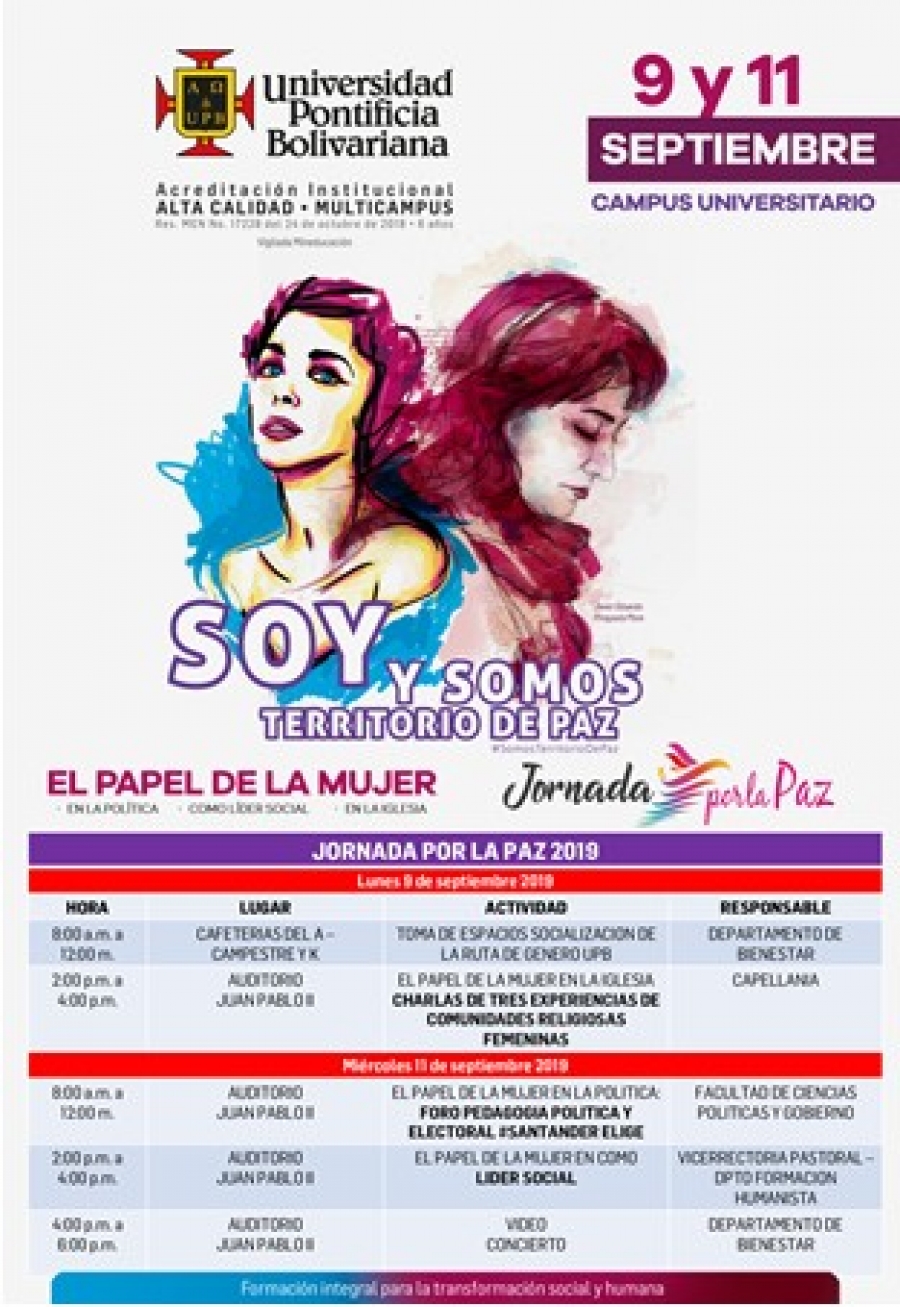 Según Diana Carolina Páez, psicóloga de la Oficina de Promoción y Prevención UPB, las actividades de esta semana irán encaminadas a empoderar y reconocer el rol de la mujer especialmente en los ámbitos universitarios, religiosos y políticos. Asimismo, se busca que la comunidad participe de estas dinámicas diseñadas desde Vicerrectoría Pastoral con el apoyo del área de Psicología y de Bienestar Universitario.