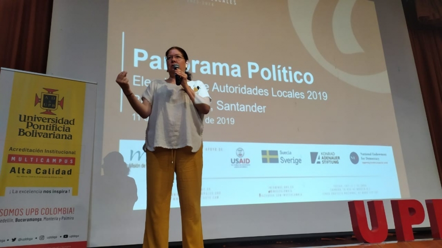Con la intención de promover la importancia de votar de manera informada, conocer muy bien cuáles son las candidaturas, cómo son las coaliciones, además de reconocer de dónde viene el dinero de las campañas en Santander, la directora de la Misión de Observación Electoral, MOE, Alejandra Barrios, orientó el foro Pedagogía Política y Electoral: el papel de la mujer en la política, realizado este miércoles en la Universidad Pontificia Bolivariana, seccional Bucaramanga.