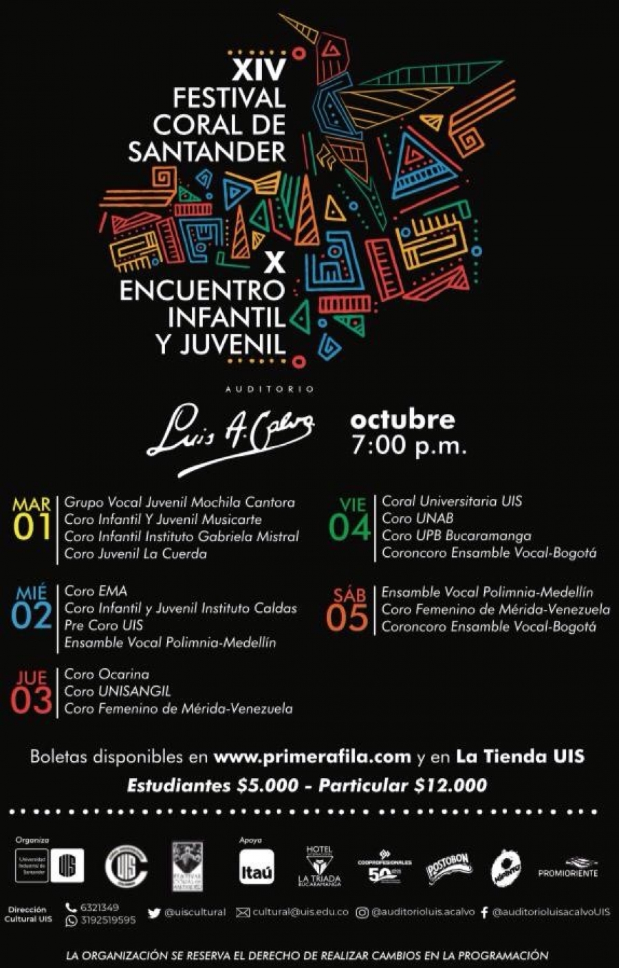 Con el fin de rendirle tributo a la música tradicional de fuentes indígenas y recordar la importancia del canto en todas las comunidades donde convive el ser humano, la decimocuarta versión del Festival Coral de Santander, que se realiza del 1 al 5 de octubre en Bucaramanga, presenta diversos grupos colombianos para ver, evidenciar y experimentar a través de ellos cómo avanza la sociedad en el ámbito cultural.