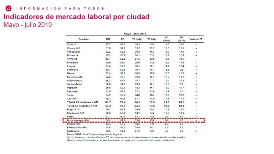 Bucaramanga se mantiene como la cuarta ciudad del país con menor nivel de desempleo, después de Cartagena, Barranquilla y Pereira quienes lideran la lista de mayor cantidad de personas con empleo en Colombia, de acuerdo con el último reporte de Mercado Laboral del Dane que demuestra además que el desempleo nacional aumentó paulatinamente en agosto del presente año, teniendo a Quibdó, Cúcuta y Valledupar liderando esta lista.