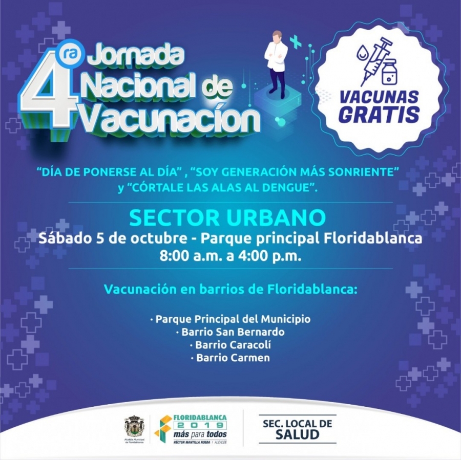 A las 4:00 de la tarde de este sábado culmina la cuarta Jornada Nacional de Vacunación gratuita que tendrá lugar en Bucaramanga y su área metropolitana con el fin de prevenir enfermedades en la población, así como completar el esquema de vacunación en niños y niñas, al igual que en población en edad fértil y gestantes a partir de la semana 26.
